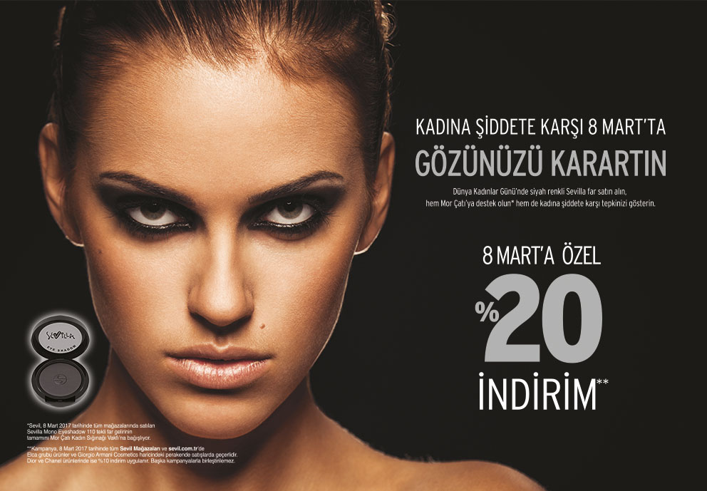 (*) Sevil, 8 Mart 2017 tarihinde tüm mağazalarında satılan Sevilla Mono Eyeshadow 110 tekli far gelirinin tamamını Mor Çatı Kadın Sığınma Vakfı’na bağışlıyor.